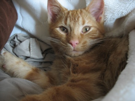 Charlie, a kitty recently adopted, enjoying a moment in his new forever home.